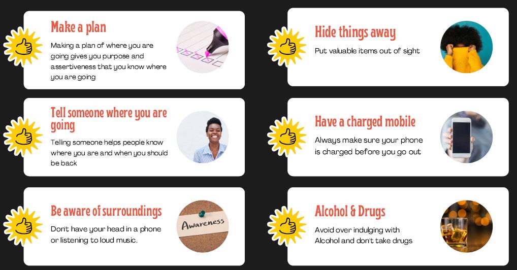 Be aware of physical and psychological threats there are in your environment, and take action to protect personal safety and make yourself less of a target. Be prepared by carrying a charged mobile phone and even a spare battery pack, a bit of cash, and letting someone you trust know where you are going. Be aware that by using headphones and your phone whilst you are walking around - even just by wearing a hoodie - you can be less aware of your surroundings and therefore more of a target. If you are under the influence of alcohol and drugs that too can reduce your reaction times and make you more vulnerable.